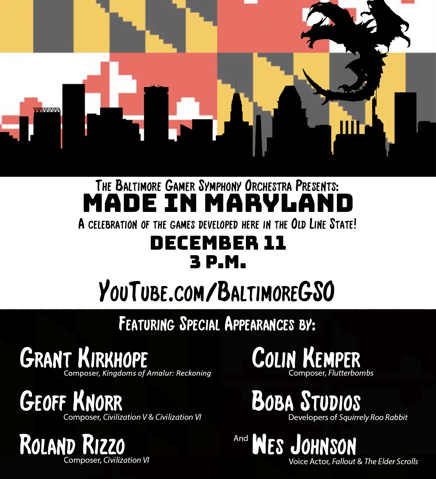 The Baltimore Gamer Symphony Orchestra (BGSO) presented their “Made in Maryland” concert virtually on December 11th, featuring music from video games that were developed in their home state. The free concert featured music from Fallout 2, Fallout 3, The Elder Scrolls II, Daggerfall, F.E.A.R. 3, XCOM, Civilization V, Civilization VI, Kingdom of Amalur: Reckoning, Flutter Bombs, and Squirrely Roo Rabbit. In addition to the music, the concert also included messages from video game music composers.